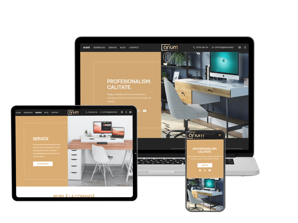 Site-ul a fost creat cu un design personalizat care se potriveste cu identitatea si imaginea firmei de fabricare mobila personalizata. Acest design atractiv si profesional tine cont de dorintele clientilor si se distinge prin originalitate. Totodata a fost optimizat astfel incat sa functioneze fara probleme pe diferite dispozitive, inclusiv desktop, tablet sau telefon. Acest lucru inseamna ca utilizatorii pot accesa site-ul oricand si de oriunde, fara a fi nevoiti sa se confrunte cu probleme de compatibilitate sau de navigare.