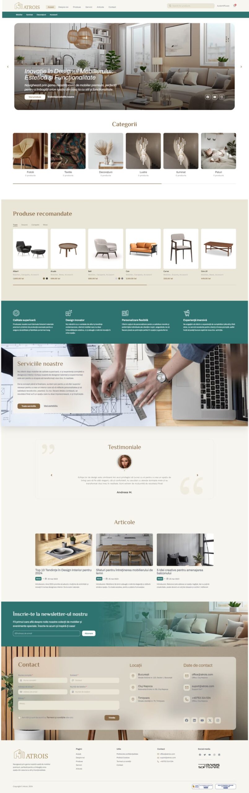 Design-ul site-ului Atrois se remarcă prin utilizarea unor culori elegante și sofisticate. Am folosit verde teal, maro și auriu pentru a crea o estetică modernă și atractivă. Aceste culori reflectă calitatea premium a produselor oferite și creează o experiență vizuală plăcută pentru utilizatori.