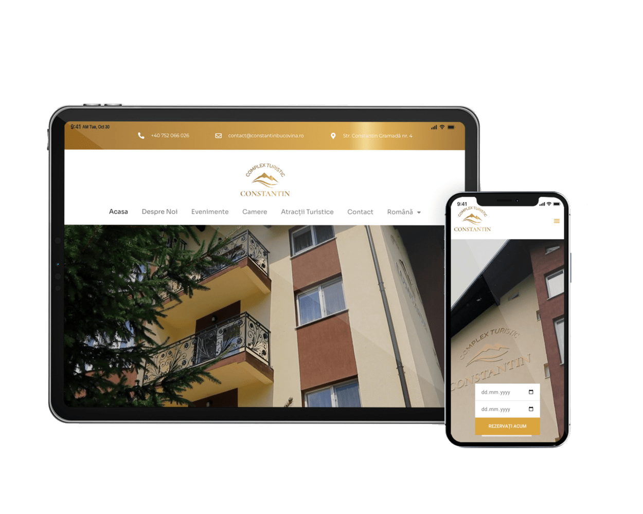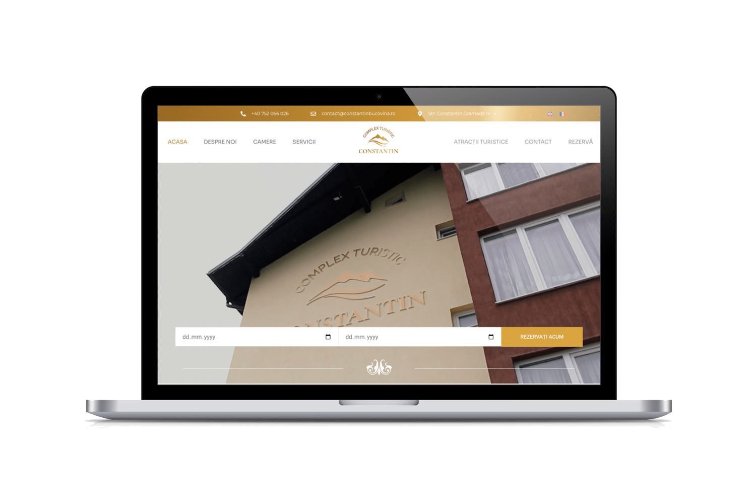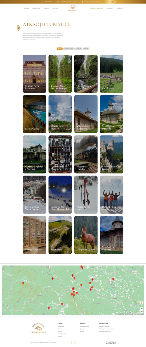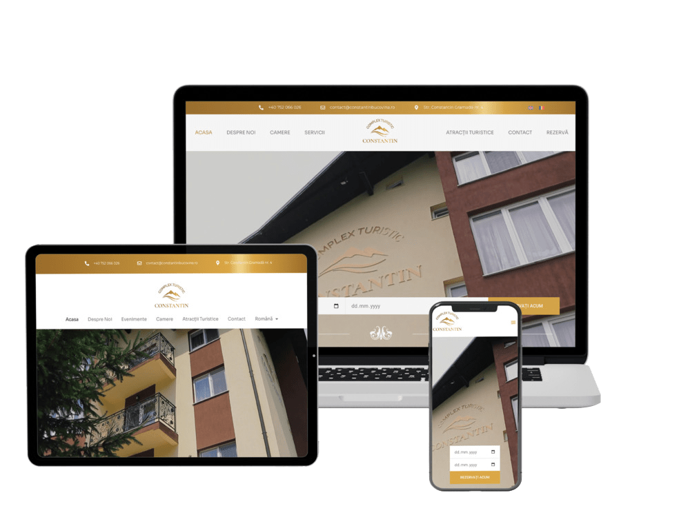 Pentru designul website-ului Complexului Turistic Constantin am folosit o paletă de culori calde și atrăgătoare, care include nuanțe de aur, caramel și alb. Aceste culori conferă website-ului un aspect elegant și ospitalier, reflectând atmosfera primitoare a complexului nostru.