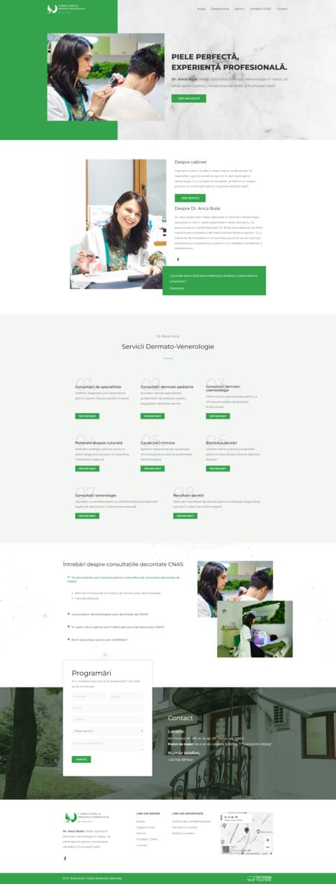 Prin intermediul unui landing page bine structurat în WordPress, Dr. Anca Bulai prezintă în mod eficient gama diversificată de servicii medicale dermatologice și venerologice. Designul simplu și navigarea ușoară contribuie la o experiență de utilizare fără probleme.
