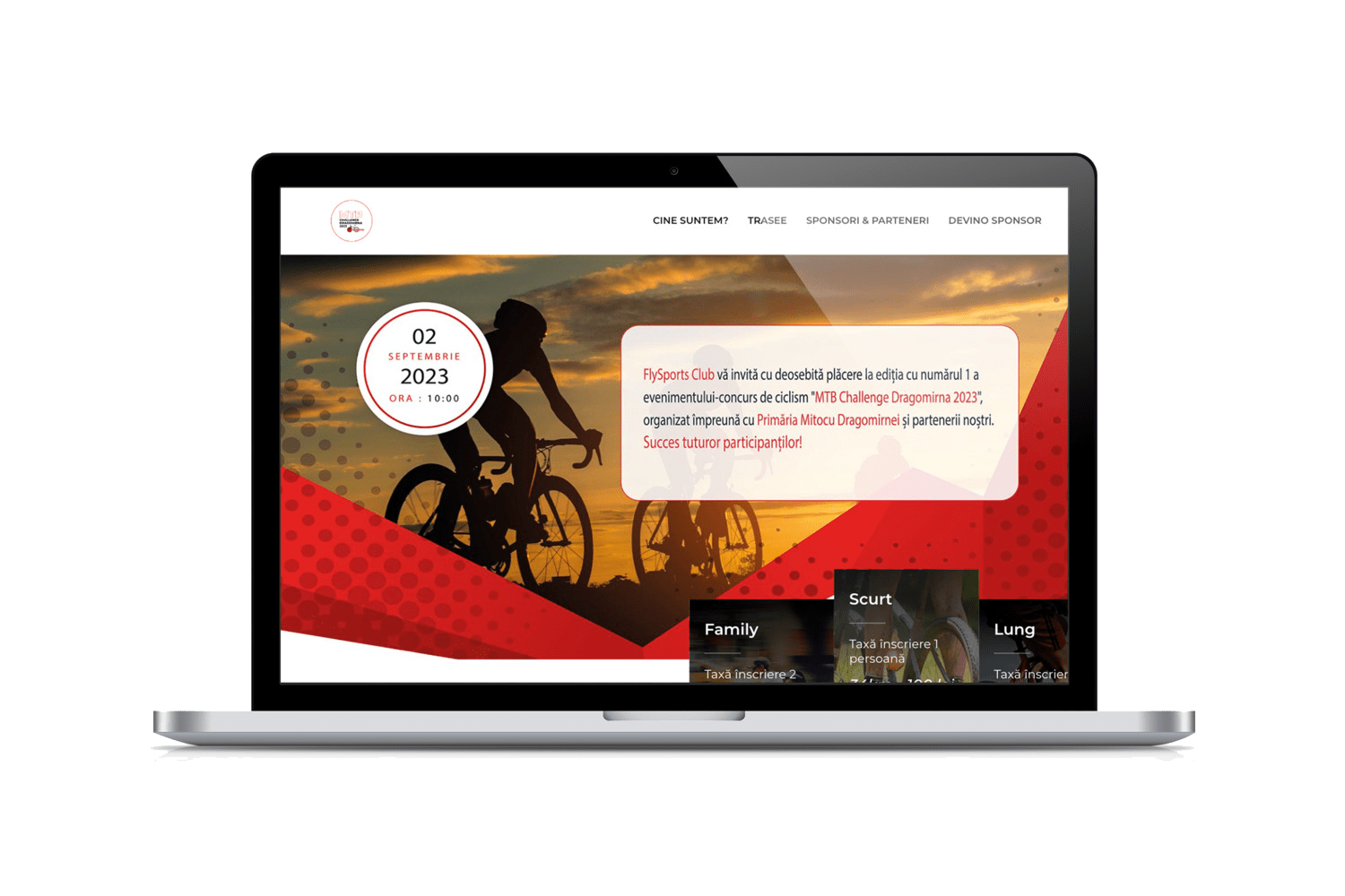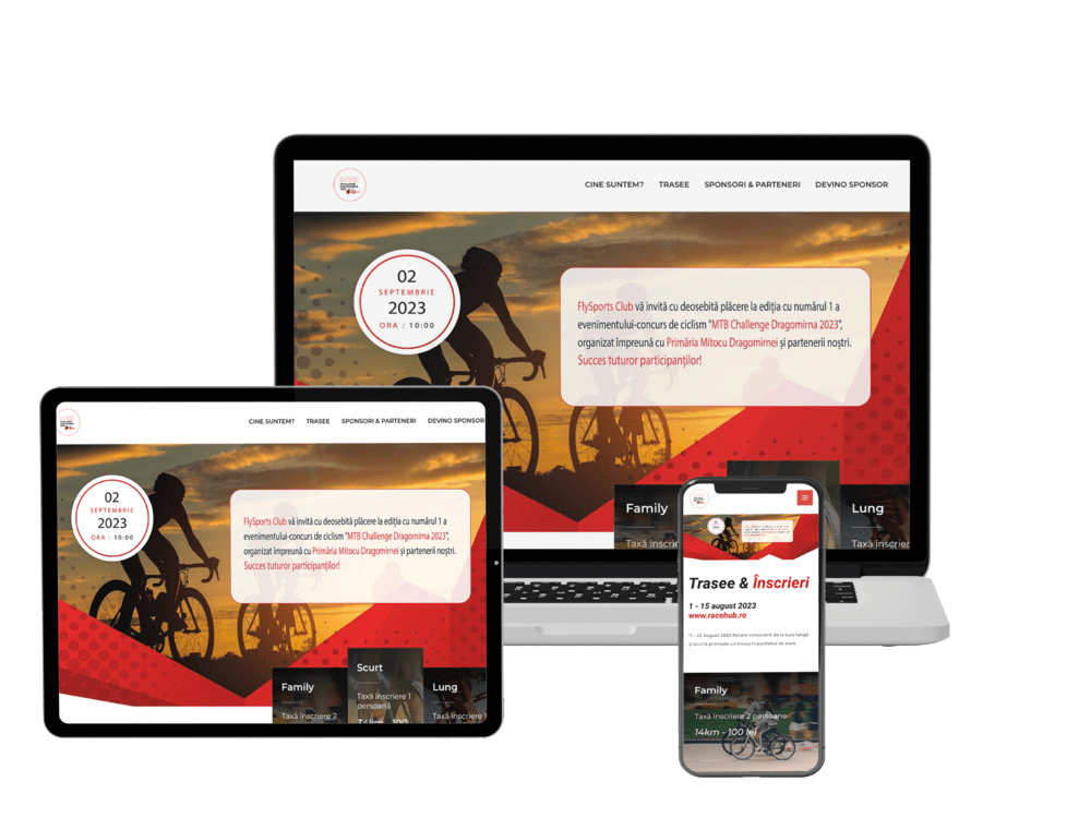 Navigarea pe landing page-ul Mountain Bike este intuitivă și eficientă. Meniul bine structurat și secțiunile distincte permit vizitatorilor să găsească rapid informațiile de interes, inclusiv detalii despre eveniment, costuri de participare și informații despre partenerii și sponsorii noștri.