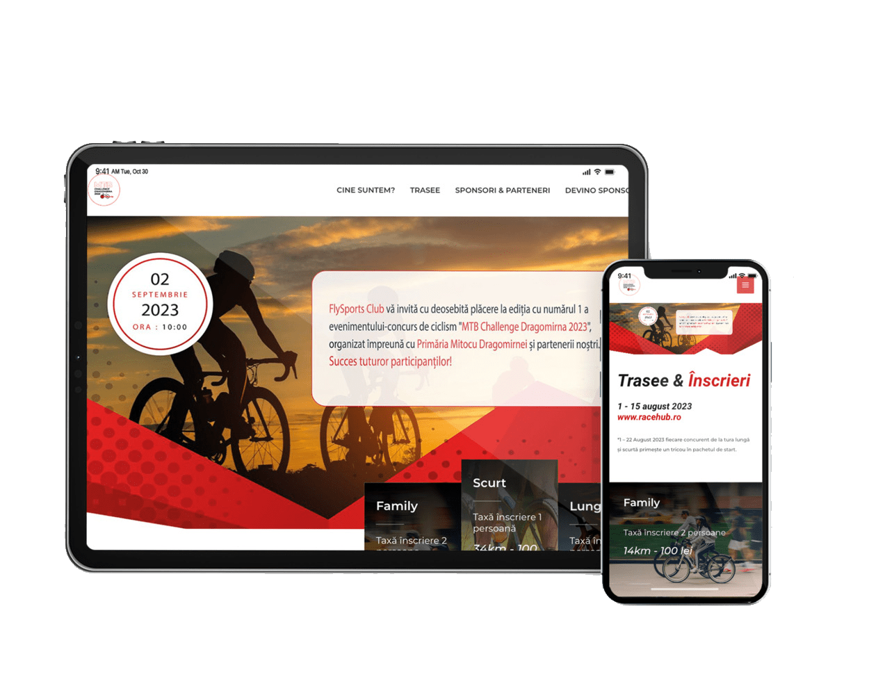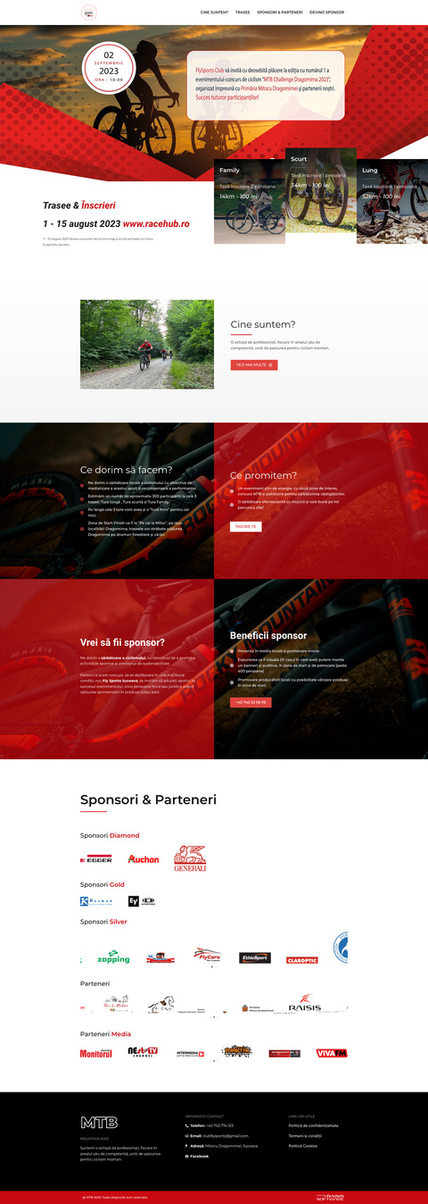 Mountain Bike este un landing page în care se prezintă evenimentul - concurs de ciclism organizat de FlySports Club alături de partenerii săi.